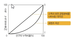 1905년 미국의 통계학자인 로렌츠(M. Lorenz)가 소득의 불평등 정도를 측정하기 위해 제안한 것으로, 인구의 누적비율을 가로축에 소득의 누적점유율을 세로축에 놓고 이들의 관계를 그림으로 표시한 곡선을 말한다. 모든 사람의 소득이 일정하다면 인구가 누적되어도 소득 누적액이 일정할 것이므로 로렌츠 곡선(Lorenz Curve)은 아래 그림의 OO′선과 같은 대각선이 된다. 반면 소득이 불평등하다면 처음에는 소득이 적은 사람들의 누적액이 더해져 그래프의 기울기가 완만하다가 뒤로 갈수록 소득이 많은 사람들의 누적액이 더해지면서 가파른 모양의 아래로 늘어진 곡선이 되며, 한 사람이 모든 소득을 다 가지고 있는 경우에는 OTO′선과 같은 모양이 된다. 따라서 로렌츠 곡선이 OO′선에 가까워질수록 분배상태가 평등하고, OTO′선에 가까워질수록 불평등 정도가 높다고 판단할 수 있다. 로렌츠 곡선은 한 나라의 소득분배 상태를 그림으로 볼 수 있다는 장점이 있으나 그 정도를 정량적으로 표시할 수 없다는 단점이 있는데, 소득분배 상태를 정량적으로 파악하기 위해서는 지니계수를 이용하여야 한다. 지니계수는 아래 그림의 대각선과 로렌츠곡선 사이의 면적을 대각선 아래 삼각형 면적 전체로 나눈 것으로, 소득분배가 완전히 평등하다면 대각선과 로렌츠곡선 사이의 면적이 0이 되어 지니계수는 0이 된다. 반대로 소득분배가 완전히 불평등하다면 대각선과 로렌츠곡선 아래의 면적이 대각선 아래 전체 면적과 같게 되므로 지니계수는 1이 된다.